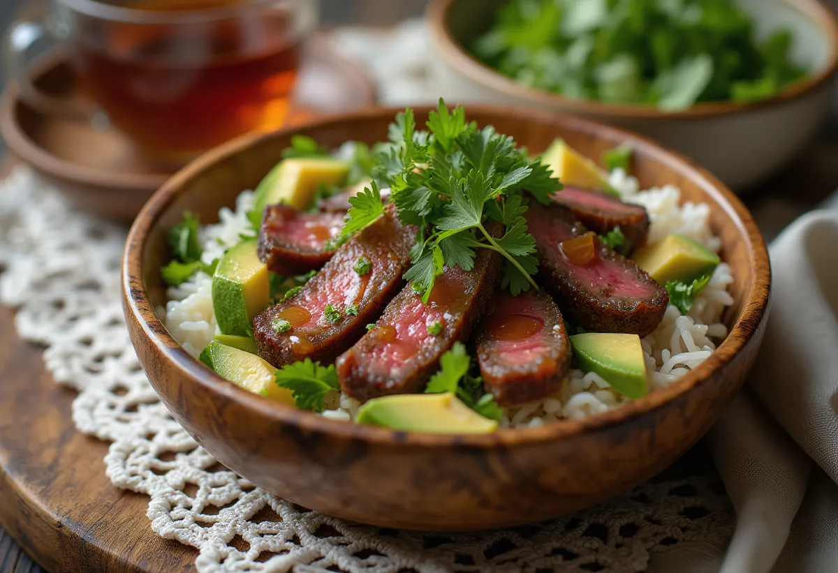 Aunque el poké es tradicionalmente de pescado, esta versión con carne de res está hecha para los amantes de sabores más robustos. Aquí sellamos la carne rápidamente para obtener una costra caramelizada por fuera, pero manteniendo el interior jugoso. Esta técnica evoca el estilo japonés 'tataki' y combina perfecto con la base de arroz.